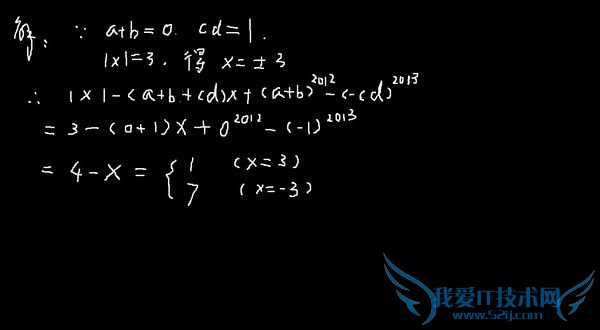 问题2:已知a、b互为相反数,c、d互为倒数,x的绝对值等于3,求x的绝对值-(a+b+cd)x+(a+b)的2012次方-(-cd)2013次方的值.[数学科目]