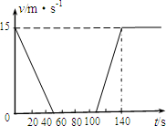 列车先做初速度为v0=15m/s,加速度为a1=0.3m/s2的匀减速直线运动,然后静止,最后做初速度为0,加速度为a2=0.5m/s2的匀加速直线运动,末速度为v=15m/s.火车运行的v-t图象如图所示