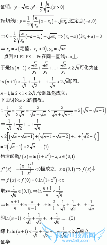 问题4:已知常数a为正实数,曲线Cn:y=根号(nx)在其上一点Pn(xn,yn)处的切线Ln总经过定点(-a,0) n为正整数 (1)求证:点列P1 P2 P3 .Pn在同一直线上(2)求证:ln(n+1)< (根号a)/y1+(根号a)/y2+...(根号a)/yn[数学科目]