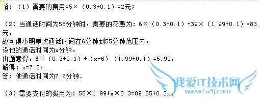 问题5:小红经常要给在外地工作的爸爸打电话 为了节省费用 她通过电信局了解到以下通话方式比较合适 用家里电话加拨11808打 缴费标准如下(不足一分钟按一分钟支付);此外 加拨11808还得支付[数学科目]