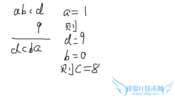 a=1因为a×9没有进位,a=1则9×d的尾数是1则d=9 b必须等于0不然要进位,已经知道abd了带入下面的式子算出C=8 则abcd=1089