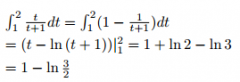 如图:其他回答∫(1,2)tdt/(t+1)=∫(1,2)(t+1-1)dt/(t+1)=∫(1,2)[1-1/(t+1)]dt=∫(1,2)dt-∫(1,2)dt/(t+1)=t|(1,2)-ln(t+1)|(1,2)=(2-1)-(ln3-ln2)=1-ln(3/2)其他类...