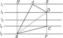 延长DC交l5于点F,延长CD交l1于点E,作点B作BH⊥l1于点H,连接BD,∵DC⊥l4,l1∥l2∥l3∥l4∥l5,∴DC⊥l1,DC⊥l5,∴∠BHA=∠DEA=90°,∴∠ABH+∠BAH=90°,∵∠...