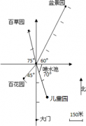 类别:数学 发布时间:16-04-17 点击:1543(1)因为图上1厘米表示实际距离是150米,所以大门与喷水池的距离是:3×150=450(米),百草园与喷水池的距离是:2×150=300(米),喷水池与盆景园的距离是:4×15...
