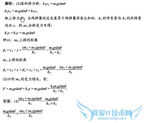 问题1:物理弹簧在倾角θ为的光滑斜面上,劲度系数分别为k1,k2的两个轻弹簧之间有一质量为m1的重物,最下端挂一质量为m2的重物,现用力F沿斜面向上缓慢推动m2,当两弹簧的总长等于两弹簧的原长之和[物理科目]