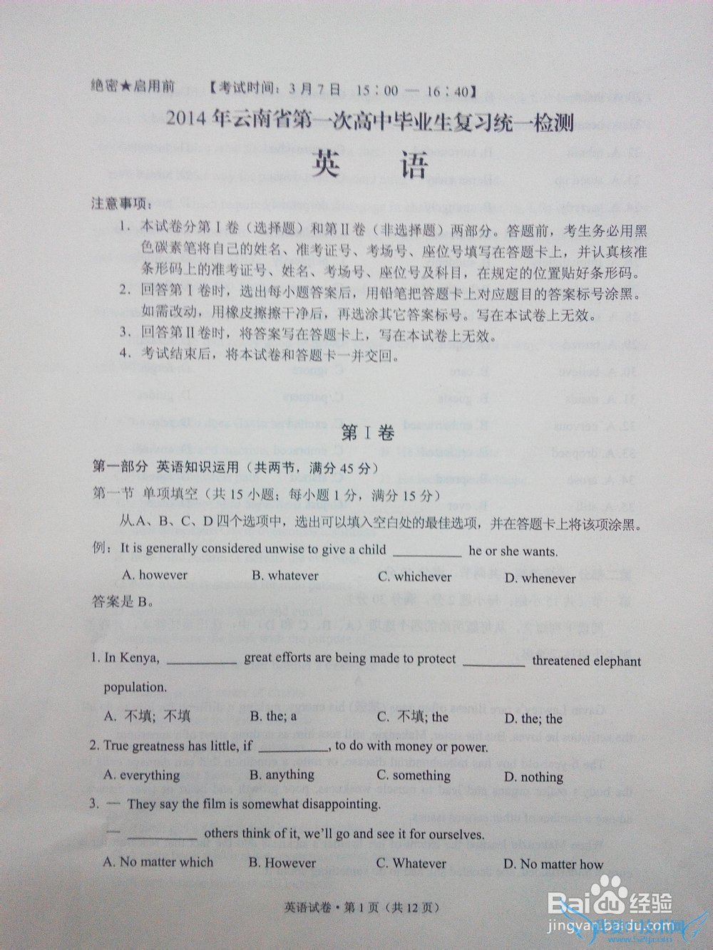 2014云南省一次省统测英语试卷