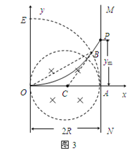 当以O点并垂直于纸面的直线为轴,将圆形磁场逆时针缓慢旋转90°时,磁场直径OA也以O点为圆心逆时针缓慢旋转90°,圆弧ABE即为旋转过程中磁场的边界.
