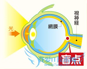 由于人眼的视神经是在视网膜上面汇集到一个点才穿过视网膜连进大脑,如果一个物体的影像刚好落在这个点上就会看不到,这个地方就是盲点.盲点的形成是进化过程中某个环节的生物视神经衍生在视网膜前端,它的后代只能在这个基础上修修补补不会再对其进行重大改动.