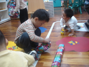 4. 让已经整理好的孩子来和老师拿包装纸。将卷筒式包装纸摊开,在孩子面前裁切下适合他玩具大小的包装纸。为孩子在中间贴上胶带后,示范如何将两旁卷起来使礼物看起来像糖果一样;