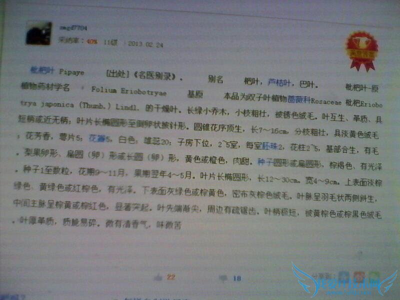 枇杷树叶的资料 20 谎沙﹌1个人 2011年10月 满意答案 枇杷叶 Pipaye [出处]《名医别录》。 别名 杷叶,芦桔叶,巴叶。 枇杷叶-原植物 药材学名 Folium Eriobotryae 基原 本品为双子叶植物蔷薇科Rosaceae 枇杷Eriobotrya japonica (Thunb.) Lindl. 的干燥叶。 长绿小乔木,小枝粗壮,被锈色绒毛。叶互生、革质、具短柄或近无柄;叶片长椭圆形至倒卵状披针形。圆锥花序顶生,长7~16cm,分枝粗壮,具淡黄色绒毛;花芳香,萼片5;花瓣5,白色;雄蕊20;子房下位,2~5室,每室胚珠2,花柱2~5,基部合生,有毛。梨果卵形、扁圆(卵)形或长圆(卵)形,黄色或橙色,肉甜。种子圆形或扁圆形,棕褐色、有光泽。种子1至数粒,花期9~11月,果期翌年4~5月。 叶片长椭圆形,长12~30cm。宽4~9cm。上表面淡棕绿色、黄绿色或红棕色,有光泽。下表面灰绿色或棕黄色,密布灰棕色绒毛。叶脉呈羽毛状两侧斜生,中间主脉呈棕黄或棕红色,显著突起。叶先端渐尖,周边有疏锯齿。叶柄极短,被黄棕色或棕黑色绒毛。叶厚革质,质脆易碎。微有清香气,味微苦 ColdEy... 2011年10月 3 1 0 相关问题 枇杷叶子能泡茶喝吗? 回答 4 枇杷树叶子变成棕色掉了咋办? 回答 1 枇杷树的叶子来煮茶,怎样煮才能更止咳? 回答 1 相关搜索 枇杷树叶子的资料 枇杷树树叶的资料 描写枇杷树叶子 问题没解决?向网友提问吧 搜狗问问 - 搜狗首页 ? 2014 SOGOU.COM