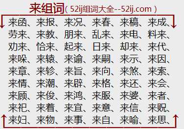 【精选组词列表】:来函、来报、来况、来春、来稿、来成、劳来、来教、朋来、乱来、来电、料来、劝来、恰来、起来、日来、却来、来代、来哚、来辕、来谕、来嗣、来示、来因、来章、来轸、来旨、来向、来煞、来索、来情、来潮、来辟、来格、来还、来会、来顾、来俊、来鸿、来服、来婆、来者、来祀、来着、来宜、来意、来信、来贶、来妇、来物、来事、来自、来喻、来思、来些、来日、来至、来效、来飨、来稔、来月、来嘻、来人、来头、来文、来同、来享、来秋、来派、来臻、来歆、来年、来去、来讯、来仪、旧来、嗟来、近来、见来、还来、来历、来暮、来龙、距来、来莅、看来、可来、格来、方来、怪来、古来、扶来、尔来、胡来、特来、下来、脱来、无来、往来、以来、修来、乡来、想来、新来、幸来、徐来、夜来、朱来、缘来、元来、悦来、昨来、坐来、转来、自来、子来、招来、用来、真来、有来、繇来、一来、神来、素来、讨来、傥来、入来、别来、比来、舶来、沓来、得来、鼎来、当来、大来、迩来、都来、从来、徂来、不来、出来、落来、两来、历来、来处、慢来、年来、前来、顷来、请来、去来、来迟、来宁、来致、来缘、来火、来件、来归、来辰、来劲、来源、来手、来廷、来哲、来使、来客、来突、来王、来禽、来早、来孙、来生、来舍、来裔、来征、来体、来庭、来胤、来到、来兹、来劫、来回、来得、来古、来翰、来今、来暨、来浪、老来、来纪、来复、来方、来假、来苏、来昆、来来、来访、来芳、来宾、来附、来晨、来朝、来觐、来笃、来萃、来集、来犯、怀来、后来、过来、乎来、回来、惠来、而来、归来、来世、来书、来由、来子、来学、来岁、来下、来往、来势、来业、来项、来札、来叶、来乃、来许、来命、来牟、来临、来路、将来、进来、今来、如来、少来、生来、本来、上来、适来、檀来、登来、到来、初来、朝来、晓来、小来、向来、未来、先来、行来、闲来、听来、倘来、算来、引来、已来、由来、慵来、原来、再来、许来、雁来、直来、暂来、云来、早来、重来、昔来、自来火、夜来香、自来食、阿来来、做出来、自来红、再来人、知来鸟、雁来客、薛夜来、谈得来、算起来、往来体、未来生、未来派、未来学、外来词、外来户、瞎来来、仙客来、不来神、不来梅、吃不来、宕出来、大古来、待都来、倒大来、飞来祸、反转来、同来育、说不来、数来宝、嗟来食、将来式、来龙儿、卷土来、来路货、过来人、赋归来、划不来、归去来、划得来、后来人、来复线、来弗及、来嚼铁、来回票、来往往、来人儿、人来疯、去来今、跑起来、没来头、来得个、买拨来、老来少、落后来、吃得来、不来气、舶来品、傥来物、到头来、到大来、打来回、飞来峰、飞来剪、赤凤来、不来头、天来大、说得来、一路来、自来水、羊负来、雁来红、熊庆来、行来衣、慵来妆、下不来、外来语、跳起来、未来身、合不来、好来宝、合得来、看起来、来梦儿、归来引、可又来、来仪所、来扇馆、来不及、来得及、来复日、马来亚、没来由、马来人、没来历、如来佛、两来子、来不得、老来子、来复枪、老来俏、来何暮、来得早、老来有喜、乐极悲来、腊尽春来、来回来去、来来去去、来复螺纹、礼尚往来、乐极哀来、乐尽悲来、拿来主义、七日来复、逆来顺受、慕名而来、掐出水来、南来北去、南去北来、暮去朝来、南来北往、明来明去、姗姗来迟、眉来语去、马来半岛、柔远怀来、秋去冬来、人来客去、人来客往、来件装配、来好息师、来情去意、来日大难、来轸方遒、来踪去迹、来者勿禁、来处不易、来者不善、来日方长、来势汹汹、来者可追、来苏之望、来日正长、来者不拒、来派过节、乐往哀来、来样加工、今来古往、卷土重来、来路不明、苦尽甜来、苦尽甘来、祸来神昧、嗟来之食、金粟如来、鉴往知来、近悦远来、极往知来、凤皇来仪、覆去翻来、福不徒来、盖地而来、否往泰来、翻来复去、番来复去、返来复去、番来覆去、蜂拥而来、饭来张口、滚滚而来、过去未来、归去来子、逛来逛去、观往知来、厚往薄来、寒往暑来、过来过往、纷至沓来、翻来覆去、好来好去、傥来之物、无胫而来、未来主义、往古来今、下不来台、熙来攘往、想来想去、言来语去、以往鉴来、雁去鱼来、直来直去、悦近来远、彰往考来、知来藏往、转来转去、紫气东来、左来右去、由来已久、迎来送往、有生以来、有凤来仪、愈来愈少、运转时来、有来无回、说来道去、数往知来、水来土掩、随手拈来、神往神来、时来运旋、时来运来、手到擒来、时不再来、手到拿来、时去时来、时来运转、说来话长、暑去寒来