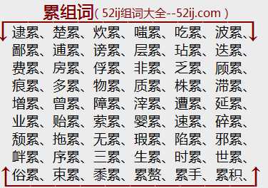 【精选组词列表】:逮累、楚累、炊累、嗤累、吃累、波累、鄙累、逋累、谤累、层累、玷累、迭累、费累、房累、俘累、非累、乏累、顾累、痕累、多累、物累、质累、株累、滞累、增累、曾累、障累、滓累、遭累、延累、业累、贻累、萦累、婴累、速累、碎累、颓累、拖累、无累、瑕累、陷累、邪累、衅累、序累、三累、生累、时累、世累、俗累、束累、黍累、累赘、累手、累积、累及、累堆、累盛、累劳、魁累、累叶、累重、累囚、累絷、累然、累卵、累茵、累趼、累席、累足、累稔、累七、累旬、累进、刘累、累路、累句、累人、累丸、累坠、累牛、累身、累欷、害累、过累、架累、羁累、贱累、口累、累祖、亏累、苦累、家累、累犯、累计、酷累、累德、累臣、累俘、累辈、累烦、累罚、累朝、累垂、累封、累牍、累帝、弱累、染累、麻累、联累、陪累、贫累、攀累、遣累、牵累、仆累、情累、疲累、取累、累气、累纸、罪累、自累、赘累、坐累、尊累、属累、重累、幼累、缘累、赃累、扬累、杂累、尤累、遗累、形累、枉累、芜累、微累、忤累、系累、湘累、小累、忝累、外累、污累、脱累、释累、受累、私累、病累、百累、熬累、尘累、缠累、贬累、荷累、后累、挂累、垢累、孤累、竿累、干累、浮累、负累、逢累、烦累、繁累、点累、带累、疵累、沈累、积累、秽累、患累、咎累、解累、拘累、连累、累官、累害、累次、累迭、累代、劳累、累乏、累迹、累爵、累绁、累日、累夜、累缀、累译、累年、累胝、累月、累岁、累洽、累圣、累形、累劫、累黍、累离、累载、累累、累屋、累心、累茧、累息、累仍、累世、累子、诮累、枪累、谴累、亲累、砌累、挈累、迁累、蓬累、民累、偏累、孥累、赔累、祛累、扰累、累进税、闹累赘、累加器、累诫不戒、累累若若、累棋之危、连阡累陌、累世通好、累土至山、累屋重架、累月经年、累牍连篇、洁身累行、积素累旧、积岁累月、积苏累块、积日累久、积德累仁、积时累日、积金累玉、积日累劳、旷日累时、连篇累册、口腹之累、连阶累任、硕果累累、血债累累、盈千累万、郁郁累累、重纸累札、铢积寸累、整年累月、重葩累藻、重熙累叶、重足累息、铢积锱累、公共积累、钝学累功、负债累累、负俗之累、顿学累功、成千累万、层台累榭、不差累黍、鄙言累句、长篇累牍、长年累月、成年累月、常年累月、穷年累岁、穷岁累月、日累月积、日积月累、桥箭累弦、联篇累牍、连编累牍、骈肩累足、穷年累月、穷年累世、骈肩累踵、弥日累夜、连帙累牍、骈肩累迹、连章累牍、累瓦结绳、累死累活、累卵之危、累块积苏、累珠妙曲、累苏积块、累土聚沙、累见不鲜、累教不改、累累如珠、连篇累牍、连篇累帧、连篇累幅、累及无辜、连篇累帙、累足成步、经年累月、积铢累寸、家累千金、积德累善、积日累岁、积年累岁、积德累功、积日累月、积累基金、积年累月、势如累卵、寸积铢累、多才为累、不爽累黍、食不累味、事危累卵、危于累卵、危如累卵、胁肩累足、以利累形、盈篇累牍、印累绶若、遗世忘累、重光累洽、重规累矩、重手累足、重熙累绩、重熙累洽、重熙累盛、铢累寸积、铢积丝累、铢寸累积、全额累进税、超额累进税、达累斯萨拉姆、资本原始积累