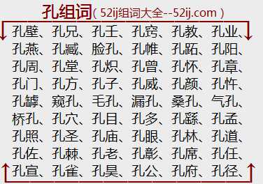 【精选组词列表】:孔壁、孔兄、孔壬、孔窍、孔教、孔业、孔燕、孔臧、脸孔、孔帷、孔跖、孔阳、孔周、孔堂、孔炽、孔曾、孔怀、孔章、孔门、孔方、孔子、孔威、孔颜、孔忤、孔罅、窥孔、毛孔、漏孔、桑孔、气孔、桥孔、孔穴、孔目、孔多、孔繇、孔孟、孔照、孔圣、孔庙、孔眼、孔林、孔道、孔佐、孔棘、孔老、孔彰、孔席、孔任、孔宣、孔雀、孔昊、孔公、孔府、孔径、孔释、孔疚、孔瘁、孔墨、孔贾、孔德、孔粒、孔皆、耳孔、孔盖、孔亟、孔懋、孔鸾、孔爵、孔姬、孔胶、孔洞、扩孔、井孔、铰孔、祭孔、姬孔、汗孔、弊孔、底孔、打孔、冲孔、窗孔、郑孔、针孔、蛀孔、周孔、一孔、蚁孔、鼻孔、射孔、视孔、瞳孔、幸孔、移孔、钮孔、面孔、盲孔、七孔、乳孔、鳃孔、孔父、孔殷、孔硕、孔郑、孔嘉、孔修、孔艰、孔时、孔隙、孔武、孔疏、孔融、孔约、孔鼎、利孔、孔偕、孔猷、孔壶、孔翠、孔急、孔规、孔桥、孔劳、孔揭、孔明、孔鸟、孔聃、孔口、孔昭、锪孔、孔阜、蠹孔、洞孔、钻孔、插孔、三孔、刺孔、穿孔、隙孔、石孔、水孔、锁孔、四孔、祀孔、镗孔、廷孔、伪孔、眼孔、微孔、箫孔、销孔、心孔、眼孔浅、眼孔小、熟面孔、馋眼孔、方孔钱、导缆孔、基孔制、孔尚任、孔繁森、孔北海、孔明灯、孔方兄、孔雀翎、冷面孔、孔雀女、七孔针、眼孔大、通气孔、伪孔传、有孔虫、肠穿孔、汗毛孔、九孔螺、九孔针、孔雀屏、单孔目、张孔山、都孔目、孔宣父、孔三传、孔雀花、孔圣人、孔乙己、孔雀舞、孔子庙、孔雀裘、孔雀扇、孔雀石、孔祥熙、孔家店、孔席不暖、孔思周情、孔武有力、孔席墨突、千疮百孔、谋夫孔多、利出一孔、孔雀王朝、孔孟之道、东家孔子、堤溃蚁孔、革带移孔、百孔千创、百孔千疮、鼻孔撩天、鼻孔辽天、鼻孔朝天、圆孔方木、无孔不钻、一孔之见、一孔不达、屏间孔雀、七孔生烟、七孔八洞、六案孔目、七疮八孔、南洪北孔、七洞八孔、孔版印刷、孔席不适、孔壁古文、孔情周思、关西孔子、三毛七孔、文案孔目、威仪孔时、无孔不入、羊真孔草、邮票齿孔、狰狞面孔、周情孔思、一鼻孔出气、孔子庙堂碑、孔雀东南飞