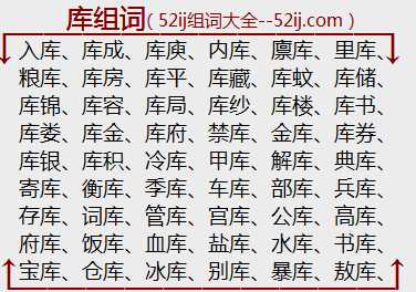 【精选组词列表】:入库、库成、库庾、内库、廪库、里库、粮库、库房、库平、库藏、库蚊、库储、库锦、库容、库局、库纱、库楼、库书、库娄、库金、库府、禁库、金库、库券、库银、库积、冷库、甲库、解库、典库、寄库、衡库、季库、车库、部库、兵库、存库、词库、管库、宫库、公库、高库、府库、饭库、血库、盐库、水库、书库、宝库、仓库、冰库、别库、暴库、敖库、衣库、宅库、月库、雉库、斋库、运库、正库、质库、贴库、五库、香库、题库、天库、土库、外库、皮库、盘库、沤库、南库、国库、骨库、军库、酒库、厩库、火库、库仑、库门、库伦、库本、库贮、库子、库帑、库簿、库司、库收、库汗、库缎、库狄、楼库、库丁、库存、库兵、库灰、四库、司库、炭库、帑库、文库、武库、眼库、银库、斧库、藩库、巴库、三库、山库、圣库、诗库、布库、程序库、长生库、草库伦、拨什库、丙字库、杜武库、丁字库、格纳库、防城库、大盈库、质典库、周礼库、左藏库、小金库、十字库、市舶库、库若干、库褥官、库斯科、库莫奚、冷藏库、九经库、国库券、封桩库、内藏库、钱谷库、人才库、五经库、备安库、石库门、数据库、死库容、四库书、乙字库、信息库、法物库、缎匹库、钞引库、激赏库、汉字库、弹药库、交引库、甲弩库、甲字库、甲仗库、架阁库、军资库、解典库、皮解库、库仑计、千仓万库、库尔德人、库希特人、库兹巴斯、基库尤人、地下水库、四库全书、清仓查库、密云水库、马库阿人、公使库本、库仑定律、土库曼人、刀枪入库、地理数据库、十三陵水库、石库门房子、土库曼斯坦、新丰江水库、新安江水库、大伙房水库、四库全书总目、阿亚库乔战役、兴都库什山脉、库尔斯克战役