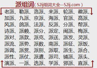 【精选组词列表】:老派、勒派、洛派、来派、轮派、徽派、加派、九派、京派、海派、官派、高派、风派、鸽派、法派、反派、分派、帮派、诗派、派赖、派分、派定、闽派、梅派、派对、派款、派克、派送、派发、灵派、派流、派势、派数、南派、派征、派饭、派调、派赏、派别、派取、派生、派合、派性、派仗、派遣、派司、铺派、派头、演派、一派、选派、学派、邪派、直派、指派、枝派、异派、杂派、右派、栽派、传派、调派、点派、嫡派、势派、时派、委派、小派、压派、托派、歪派、题派、摊派、特派、条派、认派、钦派、遣派、气派、起派、派式、派驻、派拨、派索、派演、派充、派还、派购、派衍、腔派、洒派、科派、均派、派系、末派、遴派、流派、旧派、简派、教派、急派、交派、会派、画派、公派、该派、党派、别派、编派、词派、身派、宗派、左派、做派、坐派、作派、源派、雨派、赃派、造派、征派、浙派、正派、政派、支派、远派、新派、洋派、头派、吴派、皖派、文派、西泠派、特派员、帖括派、洋务派、学院派、学衡派、中间派、走资派、双井派、反对派、反动派、当权派、红派司、公安派、临川派、两面派、理想派、名士派、清谈派、骑墙派、派不是、少壮派、黑幕派、桐城派、吴门派、现代派、湘乡派、小派别、逍遥派、象征派、未来派、长老派、保守派、保皇派、松江派、死硬派、打派仗、院体派、印象派、写实派、小家派、新派剧、新月派、新安派、野兽派、派出所、派力司、派生词、立宪派、闹宗派、岭南派、斐扬派、守旧派、实力派、改良派、噶当派、噶举派、江湖派、竟陵派、激进派、乐天派、来派过节、荷兰画派、搞两面派、风派人物、民主党派、派头十足、南北书派、一派胡言、扬州学派、雅各宾派、行动画派、枝源派本、云间诗派、浙西诗派、浙西词派、制度学派、中派主义、宗派主义、永嘉学派、鹰派人物、印象画派、永康学派、程朱学派、常州词派、耍两面派、象山学派、七月诗派、乾嘉学派、派出机构、今古学派、拉帮结派、江西诗派、吉伦特派、公羊学派、干嘉学派、常州学派、常州画派、斯文一派、百源学派、浙东学派、重农学派、源殊派异、艺术流派、异派同源、同源异派、威尼斯画派、英国经验派、百科全书派、大陆理性派、日内瓦学派、现代评论派、西山会议派、巴比松画派、鸳鸯蝴蝶派、新制度学派、新印象画派、聂斯脱利派、反右派斗争、后印象画派、拉斐尔前派、浪漫主义画派、精神分析学派、巡回展览画派