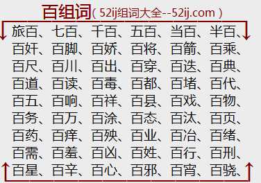 【精选组词列表】:旅百、七百、千百、五百、当百、半百、百奸、百脚、百娇、百将、百箭、百乘、百尺、百川、百出、百穿、百迭、百典、百道、百读、百毒、百都、百堵、百代、百五、百响、百祥、百县、百戏、百物、百务、百万、百涂、百态、百汰、百页、百药、百痒、百殃、百业、百冶、百绪、百需、百羞、百凶、百姓、百行、百刑、百星、百辛、百心、百邪、百宵、百骁、百寻、百辟、百辈、百倍、百宝、百般、百拜、百叶、百一、百病、百饼、百变、百城、百称、百常、百长、百昌、百廛、百层、百草、百残、百材、百花、百笏、百户、百斛、百壶、百恨、百翮、百合、百鬼、百和、百骸、百果、百滚、百官、百关、百怪、百故、百家、百济、百际、百技、百伎、百货、百计、百疾、百卉、百锾、百划、百化、百华、百喙、百会、百司、百说、百顺、百数、百蔬、百疏、百适、百室、百试、百事、百稼、百驾、百贾、百甲、百嘉、百味、百伪、百围、百为、百王、百体、百慝、百索、百死、百岁、百宿、百驷、百祀、百寺、百隧、百兽、百感、百赋、百工、百舸、百谷、百觚、百功、百弓、百夫、百凤、百冯、百封、百福、百废、百非、百方、百贩、百分、百端、百度、三百、百凡、百法、百罚、百二、百尔、百恶、一百、伍百、百节、百结、百界、百金、百精、百径、百举、百桷、百君、百钧、百苛、百克、百刻、百口、百揆、百籁、百牢、百雷、百累、百离、百罹、百礼、百里、百吏、百利、百隶、百炼、百两、百僚、百寮、百鹩、百裂、百灵、百龄、百流、百六、百楼、百禄、百侣、百虑、百率、百罗、百马、百脉、百蛮、百忙、百媚、百米、百名、百末、百亩、百木、百纳、百衲、百男、百能、百匿、百年、百念、百鸟、百牛、百弄、百诺、百帕、百辔、百朋、百篇、百品、百濮、百谱、百畦、百骑、百千、百巧、百禽、百顷、百请、百秋、百全、百泉、百人、百忍、百仞、百日、百戎、百冗、百瑞、百色、百善、百舌、百舍、百射、百身、百神、百生、百胜、百省、百十、百什、百氏、百世、百壹、百夷、百亿、百异、百役、百意、百溢、百镒、百尹、百楹、百忧、百原、百源、百怨、百粤、百越、百载、百则、百增、百盏、百战、百丈、百障、百嶂、百折、百蛰、百谪、百枝、百执、百职、百植、百祉、百指、百志、百雉、百中、百钟、百种、百众、百重、百住、百转、百啭、百拙、百啄、百子、百字、百宗、百总、百足、百族、倍百、凡百、贯百、钩百、九百、游百病、走百病、直百钱、运百甓、一百五、一百个、四百州、小百姓、小百货、五百滩、一百八、是百的、百二子、百沸汤、百分数、百分率、百分比、百幅被、百夫雄、百夫良、百夫长、百分制、百工衙、百岁羹、百兽长、百寿图、百寿汤、百损黄、百孙院、百岁索、百家衣、百家姓、百家锁、百家谱、百家饭、百世师、百家语、百事通、百兽王、百花王、百花亭、百花潭、百花洲、百圾碎、百谷王、百合科、百合花、百合病、百官图、百和香、百花醴、百花魁、百花酒、百花奖、百花朝、百城书、百城表、百步王、百步灯、百草霜、百不知、百不咋、百页窗、百一钟、百一诗、备百姓、百八丸、百般娇、百宝囊、百宝橱、八百里、百宝箱、百穴珠、百戏衣、百戏人、百像图、百药绵、百药煎、百眼橱、百叶图、百叶髻、百叶红、百叶窗、百叶竹、百叶箱、百塔寺、百味羹、百五日、百达柱、百尺楼、百虫仓、百齿霜、百齿梳、百尺堰、百尺竿、百尺杵、百辟刀、百谏图、百裥裙、百脚路、百代城、百脚旗、百结花、百结裘、百结衣、百金诺、百君子、百口桥、百辣云、百牢关、百老汇、百里才、百里君、百里宰、百炼刀、百炼刚、百炼钢、百炼鉴、百炼金、百炼镜、百炼铅、百两金、百两篇、百灵鸟、百六公、百六掾、百漏船、百禄儿、百面雷、百木长、百衲碑、百衲本、百衲琴、百衲衣、百囊网、百年歌、百年诗、百鸟房、百鸟衣、百篇科、百品味、百千般、百钱卜、百禽长、百全计、百人会、百日丹、百日红、百日黄、百日咳、百日粮、百日青、百乳彝、百色市、百舌儿、百舌鸟、百舌子、百益红、百韵笺、百杂香、百丈须、百折裙