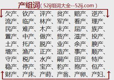 【精选组词列表】:欠产、钦产、评产、贫产、赔产、逆产、流产、临产、林产、军产、看产、理产、民产、难产、木产、末产、屈产、族产、置产、中产、做产、赀产、滋产、投产、土产、托产、脱产、业产、余产、腴产、增产、渔产、正产、造产、事产、顺产、守产、税产、水产、嗣产、田产、特产、稳产、停产、宝产、豹产、抱产、包产、财产、产床、产莳、产翁、产卵、产妇、产科、产生、产褥、货产、活产、化产、核产、籍产、减产、谷产、估产、海产、单产、低产、敌产、荡产、催产、出产、寸产、产具、产期、产院、产乳、产牧、产嘏、产儿、产量、丁产、动产、房产、飞产、多产、硐产、改产、丰产、高产、干产、破产、平产、落产、瞒产、陆产、矿产、农产、名产、居产、家产、甲产、国产、蹇产、绝产、亏产、均产、没产、公产、官产、恒产、诡产、第产、导产、断产、地产、倒产、世产、试产、庶产、死产、私产、同产、析产、物产、畜产、小产、天产、秀产、行产、胥产、血产、养产、遗产、玉产、引产、异产、营产、治产、殖产、优产、訾产、子产、转产、坐产、祖产、资产、早产、珍产、产穑、产媪、产房、产子、产后、产门、产假、产马、产前、产销、产额、产蓐、产母、产的、产婆、常产、产殖、产育、产物、产难、产业、产舍、超产、产权、产疾、产品、产植、产气、产地、产道、产羊、产利、生产、山产、慎产、盛产、半产、并产、变产、别产、薄产、不动产、生产率、生产力、生产品、产后热、产褥热、助产婆、总产值、再生产、有产者、小生产、土特产、预产期、同产子、水产业、半脱产、房地产、房产主、妇产科、林产品、农产物、副产物、房产税、二产妇、产褥期、产后风、共产党、副产品、经产妇、净产值、产母痨、财产权、生产者、生产操、无产者、同产弟、助产士、遗产税、剖腹产、产权证、没出产、奴产子、年产量、农产品、倾家荡产、倾家破产、清产核资、清洁生产、破产荡业、破家丧产、破家荡产、破业失产、木沉产子、名牌产品、露台之产、流动资产、矿产储量、小产权房、墓产经济、绿色产房、人工流产、文明生产、文化遗产、无形资产、支柱产业、中间产品、自产自销、私人财产、生产周期、生产要素、无产阶级、财产保全、财产关系、财产保险、不治生产、必要产品、固定资产、国家财产、集体财产、基础产业、工业产品、公共产品、公共财产、个人财产、公司破产、共产主义、草茅之产、产品质量、递延资产、短线产品、第三产业、荡产倾家、剩余产品、房地产业、分烟析产、流水生产、人奴产子、拳头产品、没收财产、倾家尽产、倾家竭产、倾家败产、弃家荡产、弃业变产、破家竭产、破家败产、劳联产联、国有资产、工业产权、共产国际、分家析产、第一产业、第二产业、沉灶产蛙、私产制度、小有产者、信息产业、资产阶级、坐产招夫、最终产品、中产阶级、知识产权、产业工人、产业革命、产家大器、产业结构、产业政策、产业资本、查田定产、生产配置、生产关系、生产过剩、生产能力、沈灶产蛙、生产资料、生产手段、生产劳动、生产基金、生产工具、生产方式、生产布局、商品生产、半无产阶级、生产合作社、生产力标准、生产专业化、生产社会化、中国共产党、资产负债表、自动化生产、新中产阶级、新产品开发、小资产阶级、大资产阶级、非生产劳动、法人财产权、共产党宣言、简单再生产、旧中产阶级、房地产市场、大生产运动、包产到户制、人口再生产、劳动生产率、扩大再生产、流氓无产者、民族资产阶级、资产阶级革命、战时共产主义、无产阶级专政、共产主义风格、共产主义精神、共产主义理想、共产主义社会、简单商品生产、国民生产总值、国民生产净值、官僚资产阶级、青年共产国际、欧洲共产主义、平均共产主义、买办资产阶级、科学共产主义、空想共产主义、军事共产主义、国内生产总值、共产主义道德、共产主义小组、工业生产体系、共产主义劳动、无产阶级道德、资产阶级道德、资产阶级专政、生产要素市场、生产资料市场