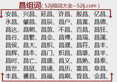 【精选组词列表】:安昌、兴昌、延昌、许昌、殷昌、亿昌、永昌、肇昌、昌辰、昌户、昌富、昌德、昌达、昌朝、昌菹、不昌、百昌、昌狂、昌谷、昌繁、昌会、昌博、昌瑞、昌蒲、昌侯、昌大、昌炽、昌濮、昌符、昌丰、昌辉、昌本、昌门、炽昌、昌雄、昌羊、昌时、昌亡、昌盛、昌义、昌熟、昌泰、昌世、昌鼠、昌诵、昌历、富昌、阜昌、丰昌、蕃昌、昌福、昌期、昏昌、会昌、鼎昌、归昌、明昌、隆昌、克昌、融昌、梁昌、连昌、披昌、宁昌、荣昌、瑞昌、光昌、贵昌、福昌、番昌、繁昌、昌仆、昌光、纪昌、吉昌、昌阳、昌衍、昌言、昌遐、昌洋、昌图、昌兴、昌衢、昌茂、昌黎、昌延、昌庭、昌旺、昌舒、昌翔、昌熙、昌明、昌基、昌晖、昌辞、昌霍、昌阜、昌风、昌导、昌教、昌昌、昌披、昌隆、昌化、昌年、昌乐、昌九、昌容、昌懋、昌姬、昌华、昌云、昌逸、昌作、昌族、昌运、昌意、昌胤、昌志、伯昌、白昌、显昌、遐昌、寿昌、盛昌、文昌、吴昌硕、唐昌观、西伯昌、徐世昌、宜昌市、武昌鱼、王昌龄、王淦昌、文昌省、昌华苑、丁汝昌、东昌纸、邓世昌、董其昌、焕阳昌、蒲昌海、南昌市、李昌镐、金昌市、吉鸿昌、金昌亭、连昌宫、韩世昌、韩昌黎、昌蒲菹、昌化石、昌盍风、武昌柳、昌都县、张宗昌、文昌君、文昌鱼、文昌帝、西昌市、阿昌族、韦昌辉、文昌台、文昌缠斗、武昌剩竹、武昌官柳、武昌起义、繁荣昌盛、顺昌之战、乐昌破镜、乐昌分镜、浸明浸昌、南昌会战、日富月昌、南昌起义、乐昌之镜、谔谔以昌、昌亭旅食、昌言无忌、昌亭之客、昌明童子、文昌帝君、武昌春柳、五世其昌、谋先则事昌