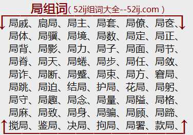 【精选组词列表】:局戚、扃局、局主、局套、局僚、局奁、局体、局骥、局境、局数、局定、局正、局背、局影、局力、局子、局面、局节、局脊、局天、局蜷、局步、局任、局敛、局诈、局断、局蹙、局束、局方、窘局、局跳、局迫、结局、护局、花局、局躬、局守、局趣、局念、局量、局隘、局格、局麻、局致、局身、局骗、局顾、局蹄、搅局、鉴局、决局、拘局、局署、款局、局操、局席、开局、厘局、路局、临局、六局、库局、冷局、终局、舞局、形局、谳局、要局、走局、隘局、转局、饮局、顺局、事局、司局、水局、税局、私局、踏局、体局、骰局、伪局、诗局、败局、宝局、散局、跟局、公局、寒局、过局、和局、计局、羁局、捡局、机局、风局、饭局、坊局、赌局、对局、定局、带局、大局、敕局、迟局、常局、曹局、残局、布局、成局、长局、镳局、镖局、变局、褊局、入局、蜷局、楸局、拳局、曲局、钱局、器局、浅局、奇局、谱局、骗局、排局、蹒局、气局、木局、内局、局尺、局度、局宇、局干、局躅、局蹴、局分、局气、局段、局跽、局蠼、局限、局顿、局囿、局板、局钱、局赌、局笮、局琐、局票、局曲、局迹、局局、局外、局司、局屈、局察、局碎、落局、敛局、了局、离局、乐局、捐局、局足、局陈、局调、局促、局家、局勇、棋局、鸣局、起局、平局、牌局、炮局、全局、前局、现局、箫局、象局、五局、闲局、限局、完局、猥局、危局、信局、虚局、铁局、石局、收局、史局、时局、世局、势局、书局、耸局、设局、识局、博局、卑局、夜局、一局、邮局、意局、弈局、驿局、银局、玉局、月局、越局、狱局、战局、智局、植局、制局、质局、置局、做局、准局、主局、诈局、志局、震局、知局、踯局、中局、妆局、政局、彩局、边局、畚局、承局、钞局、才局、创局、筹局、吃局、出局、丞局、电局、堕局、丹局、负局、干局、腐局、抚局、弓局、伏局、分局、覆局、格局、方局、拐局、翻局、当局、抵局、京局、局图、局缩、倦局、酒局、局窄、局卡、局戏、局滞、局务、局部、局镇、局势、官局、箭局、检局、僵局、哄局、叫局、揭局、近局、静局、救生局、糊弄局、假局子、机器局、官书局、鼓铸局、慈幼局、短局促、长行局、中统局、支应局、制局监、谘议局、鞍子局、邮政局、玉局化、玉局翁、运送局、驿政局、邮便局、邮电局、昭信局、邮务局、宝源局、善后局、汤饼局、团防局、警察局、软脚局、软局子、榷运局、榷场局、楸玉局、起功局、美人局、局外人、局限性、局中人、负局生、迷魂局、民信局、宝泉局、机匠局、活局子、积善局、胡弄局、公估局、工部局、负局翁、负局仙、石首局、生药局、玉局观、招商局、玉局仙、咨议局、银圆局、印刷局、香药局、小家局、厘捐局、厘金局、军统局、局内人、浣衣局、果子局、电话局、文报局、局域网、局外之人、中华书局、通观全局、世界书局、顽狭短局、全局在胸、局地钥天、局天扣地、局地吁天、局天促地、内宝钞局、盐厘总局、无关大局、闲曹冷局、陷入僵局、盱衡大局、四司六局、水功德局、生产布局、已成定局、不识局面、长安棋局、不顾大局、背碑覆局、顾全大局、负局先生、当局者迷、纯属骗局、局骗拐带、局促不安、局地扣天、局部麻醉、工业布局、将奋足局、江南制造局、欧洲空间局、全局与局部、福州船政局、交通运输布局、城市总体布局、
