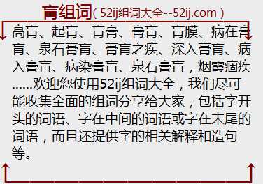 【精选组词列表】:高肓、起肓、肓膏、膏肓、肓膜、病在膏肓、泉石膏肓、膏肓之疾、深入膏肓、病入膏肓、病染膏肓、泉石膏肓,烟霞痼疾