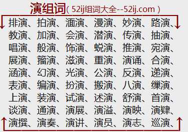 【精选组词列表】:排演、拍演、湎演、漫演、妙演、路演、教演、加演、会演、潜演、传演、抽演、唱演、般演、饰演、蜕演、推演、宛演、展演、籀演、滋演、重演、演诵、合演、涵演、幻演、光演、公演、反演、递演、表演、编演、扮演、搬演、八演、缫演、上演、装演、试演、述演、舒演、首演、谈演、通演、演展、演溢、演映、演肄、演撰、演奏、演讲、演员、演志、巡演、天演、宣演、演台、演诰、演畅、庆演、谱演、配演、骈演、派演、论演、流演、课演、开演、讲演、爨演、辍演、串演、出演、崇演、操演、布演、汇演、敷演、调演、导演、演史、演教、演戏、演练、演样、演算、演义、演唱、演梵、演草、演帐、演示、演变、演造、演略、演谋、演阵、演习、演化、摇演、演派、演证、演延、演道、演说、演递、演言、演承、演迤、演禽、演撒、演蜕、演法、演念、演进、演行、演兴、义演、游演、预演、演释、演试、演易、演绎、演艹、演剧、演纪、演步、演词、演述、演纶、演成、演译、演迪、演辞、演艺、演幌、演武、演漾、演思、演经、演门、演陈、主演、演播、演稿、演礼、演技、演出、演草本、演绎法、演出本、演易台、演武场、演兵场、演连珠、大演数、表演赛、演武厅、天演论、表演唱、邓演达、故伎重演、故技重演、泓涵演迤、配音演员、时装表演、三国演义、隋唐演义、替身演员、演古劝今、演绎证明、修文演武、即兴表演、军事演习、抽演微言、表演艺术、封神演义、演绎推理、野外演习、愈演愈烈、演武修文、运筹演谋、杨家府演义、电视演播室、洪秀全演义、东西晋演义、东汉通俗演义、西汉通俗演义