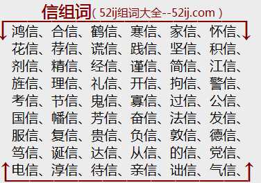【精选组词列表】:鸿信、合信、鹤信、寒信、家信、怀信、花信、荐信、谎信、践信、坚信、积信、剂信、精信、经信、谨信、简信、江信、旌信、理信、礼信、开信、拘信、警信、考信、节信、鬼信、寡信、过信、公信、国信、幡信、芳信、奋信、法信、发信、服信、复信、贵信、负信、敦信、德信、笃信、诞信、达信、从信、的信、党信、电信、淳信、待信、亲信、诎信、气信、虔信、微信、善信、然信、齐信、叵信、遣信、情信、弃信、明信、跑信、溺信、鸟信、逆信、密信、迷信、柳信、昧信、盟信、梅信、麦信、盲信、潮信、采信、宠信、诚信、村信、不信、布信、骠信、便信、贲信、背信、捎信、梢信、实信、守信、失信、保信、报信、榜信、委信、通信、体信、死信、托信、违信、写信、信印、信义、信誓、信凭、小信、信笔、信底、信鸿、信伏、信誉、信片、信女、信慕、信臣、信禽、信步、信贷、信袋、信封、信布、信星、凶信、信越、信简、信尚、信解、信爱、信都、信脚、信君、信望、信悦、信诞、信风、信心、信信、信件、信效、信交、信牒、信言、信服、信纳、信知、信石、信儿、信嘴、信筒、信圭、信具、有信、遵信、庾信、远信、越信、责信、杖信、信问、自信、准信、征信、置信、依信、言信、引信、音信、信陵、信笺、信了、信士、信瓤、信箱、信命、信物、信次、信宿、信凫、信重、信仗、信标、信鸽、信经、信意、信让、信据、绪信、信敬、信插、信用、信乡、信管、信差、信向、信条、信验、信受、信从、信幡、信纸、信鸥、信矢、信约、信节、信欺、信数、信慎、信教、信道、信必、信顺、信息、信识、信货、信听、信地、信汇、信口、信友、信眉、信托、信函、信箭、信套、信鸟、信众、信守、信官、信恃、信谳、信惮、信号、信悫、信力、信念、信厚、信徒、信衣、倚信、驿信、遗信、印信、义信、秧信、鱼信、雨信、月信、渊信、约信、主信、真信、证信、执信、至信、旨信、正信、直信、贞信、忠信、钟信、质信、众信、宗信、竺信、尊信、资信、专信、营信、行信、雅信、雁信、信局、信笼、信杖、养信、信遇、信子、信委、信任、信玺、信牌、信面、信赖、信瑞、信使、信器、信诚、信赏、信香、商信、示信、上信、审信、秉信、传信、崇信、长信、探信、透信、霜信、使信、誓信、书信、水信、爽信、丰信、风信、谛信、庚信、覆信、孚信、符信、恩信、边信、大信、春信、韩信、贺信、话信、归信、黑信、荒信、温信、闻信、威信、头信、听信、推信、讨信、檀信、顺信、素信、送信、问信、无信、狎信、误信、乡信、喜信、信幸、信威、相信、信响、信然、信潮、信手、信马、信实、信旗、信水、信待、信行、信内、信仰、信史、信炮、信考、信鼓、信札、信书、信符、信谨、信邪、信足、信音、信访、信耗、信人、信定、信奉、信崇、晓信、信真、轻信、倾信、秋信、屈信、任信、瑞信、仁信、取信、确信、钦信、凭信、泥信、捻信、名信、求信、起信、平信、偏信、期信、敬信、口信、快信、来信、宽信、近信、回信、寄信、活信、黄榆信、花信风、讲理信、匿名信、民信局、梅花信、信息论、信天公、信得及、信噪比、通信兵、通信鸽、航空信、国信使、通信网、风信子、风信旗、传信鸟、逼供信、书信体、书信馆、通信社、通信员、谁信道、信得过、信号弹、信皮儿、自信心、昭信局、信达雅、信阳市、信用社、信号旗、信用卡、信号枪、信息库、幺帮信、周信芳、赵信城、昭信票、信赏钱、信天游、信陵君、信号灯、信天翁、信德人、信不及、信任案、送信儿、保价信、长信宫、不足信、露口信、晾花信、拣信生、念信儿、明信片、千里信、平安信、青泥信、传信牌、风信鸡、公开信、公信力、挂号信、韩信坛、介绍信、急脚信、鸡毛信、激光通信、皇帝信宝、花信年华、果刑信赏、果于自信、经济信息、讲信修睦、将信将疑、寡信轻诺、丹青之信、旦旦信誓、笃信好学、电子信箱、道德信念、轻诺寡信、轻言寡信、弃义倍信、诎寸信尺、讷直守信、弃信忘义