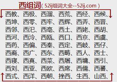 【精选组词列表】:西教、西极、西溜、西荒、西经、西候、西坤、西零、西牢、西辉、西弄、西晋、西邻、西汜、西亳、西土、西姥、西胡、西河、西泠、西瓯、西口、西京、西虞、西药、西偏、西秦、西定、西岐、西仔、西裔、西广、西东、西畴、西人、西士、西寝、西真、西菜、西屠、西墉、西引、西刘、西亚、西欧、西席、西儒、西蕃、西式、西洋、西朝、挫西、生西、山西、沙西、擦西、泰西、水西、西光、西曹、西岳、西非、西僧、西施、西都、西头、西垣、西阳、西文、西陆、西塾、西师、西村、西蚕、西归、西倾、西餐、西州、西商、西鄙、西语、西风、西蜀、西母、西舍、西邸、西吴、西厂、西西、西伯、西王、西旅、西宇、西成、西台、西周、西戎、西清、西漆、西班、西域、西点、西门、西向、西迁、西社、西序、西装、西崽、西申、西夏、西皮、西塞、西瓜、中西、西天、西钱、西曲、西氏、西夷、西溟、西北、西南、西晒、西夕、西省、西洱、西音、西陲、西宛、西帝、西迟、西壤、辽西、景西、陇西、欧西、偏西、摩西、河西、杭西、西宫、西郭、西圉、西照、西医、西边、西胶、西荣、西窑、西竺、西宾、西沉、西墙、西上、西乞、西垂、西堂、西室、西阶、西府、西爽、直西、竹西、西洼、西笑、西谚、西膜、西楚、西官、西方、西缶、西干、西奎、西山、西化、西馆、西毛、西崦、西兴、西气、西内、西学、西邑、西林、西哲、西斋、西藩、西虢、西冥、西颓、西蟾、西皇、西景、西市、西番、西礼、西江、西华、西辟、西国、西金、西掖、西湖、西纪、西锦、西池、西园、西颢、西储、西枢、西荆、西乡、西捕、西洲、西道、西关、东西、西服、西子、西狩、西海、西陵、西羌、西乐、西晖、西镐、西苑、西灵、西嫁、西汉、西疆、西夹、西历、西后、西老、西皓、西驾、西昆、西封、巴西、三西、寿西、日西、平西、关西、公西、归西、海西、江西、华西、格西、东西步、露西亚、里西湖、老东西、老西儿、锦西风、江西省、鸡西市、坏东西、法西斯、庖西书、南西厢、纳西族、泼东西、清西陵、沈西苓、瘦西湖、陕西省、水西寺、西山爽、大西米、北西厢、碧牙西、巴西侯、西洲曲、吴冷西、西红柿、西蓝花、西康省、东西厂、大西北、大西洋、东西玉、西洋镜、西雅图、西葫芦、西泠派、西山药、西部片、西王母、西佛爷、熊佛西、西江月、走西口、醉西施、玉东西、玉西东、西南亚、西州泪、西樵山、西州门、西山夫、西州路、西门子、西施洞、西字脸、西曲歌、佛兰西、江西蜡、江西腊、狗东西、墨西哥、西洋参、西益宅、西宁市、西洋景、西太后、西第颂、西秦腔、西游记、新西兰、牙克西、西施山、西施乳、西昌市、西游补、西班牙、西半球、西施舌、西洋画、西夜国、西伯昌、石西民、升西天、泰东西、魏征西、班加西、上西天、丁西林、定西番、东西厢、西南夷、西洋记、西涅克、西凉乐、西厢记、西安市、西昆体、西陵桥、西子湖、西林桥、西邻玉、西陵峡、西哈诺、西泠印社、西泠八家、西啷花啷、西门豹渠、西方圣人、西进运动、西撒哈拉、西眉南脸、西牛货洲、西奈半岛、东捞西摸、东奔西走、东飘西荡、东冲西撞、东央西告、东扯西拽、东砍西斫、东驰西撞、东…西…、东来西去、东诓西骗、东拼西凑、东拉西扯、东跑西颠、东挪西撮、东家西舍、东猜西疑、东徙西迁、东流西落、东行西步、东西易面、东冲西突、拆西补东、拆东补西、滁州西涧、东驰西骋、东涂西抹、东歪西倒、东眺西望、东声西击、东撙西节、东迁西徙、道西说东、东封西款、朝西暮东、抱痛西河、山西梆子、唐突西施、痛抱西河、推东主西、偷东摸西、题西林壁、田纳西河、西方世界、西府海棠、西安事变、西方净国、西夏王陵、西西里岛、西点军校、西伯利亚、西落鬼戎、西班牙语、西沙群岛、西食东眠、西施捧心、西北大学、西风落叶、西牛贺洲、西风残照、西山日薄、西方国家、西山日迫、拄笏西山、一命归西、浙西诗派、转东过西、安西四镇、吸西北风、西山饿夫、西班牙港、西风漂流、西方净土、西颦东效、西台痛哭、桑苏西宫、日东月西、日落西山、辽西走廊、井原西鹤、林西遗址、拉东补西、科西嘉岛、盘尼西林、墨西哥人、扶东倒西、呋喃西林、东瞻西望、东漂西徒、东掩西遮、东挪西辏、东渐西被、东倒西歪、东序西胶、东支西吾、东躲西逃、东荡西游、东扭西歪、东舟西舫、东零西落、东西南朔、东摇西摆、东躲西跑、桂平西山、驾鹤西游、法西斯党、东张西觑、新西兰人、西双版纳、西窗剪烛、西歪东倒、指东话西、指东打西、指东划西、指东说西、指东画西、浙西词派、中西合璧、赞比西河、西萨摩亚、游山西村