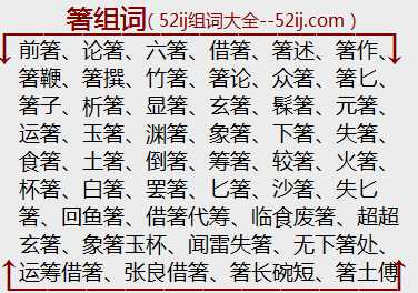 【精选组词列表】:前箸、论箸、六箸、借箸、箸述、箸作、箸鞭、箸撰、竹箸、箸论、众箸、箸匕、箸子、析箸、显箸、玄箸、髹箸、元箸、运箸、玉箸、渊箸、象箸、下箸、失箸、食箸、土箸、倒箸、筹箸、较箸、火箸、杯箸、白箸、罢箸、匕箸、沙箸、失匕箸、回鱼箸、借箸代筹、临食废箸、超超玄箸、象箸玉杯、闻雷失箸、无下箸处、运筹借箸、张良借箸、箸长碗短、箸土傅籍