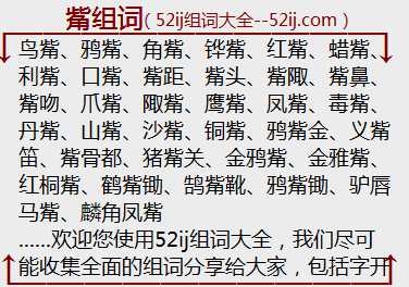 【精选组词列表】:鸟觜、鸦觜、角觜、铧觜、红觜、蜡觜、利觜、口觜、觜距、觜头、觜陬、觜鼻、觜吻、爪觜、陬觜、鹰觜、凤觜、毒觜、丹觜、山觜、沙觜、铜觜、鸦觜金、义觜笛、觜骨都、猪觜关、金鸦觜、金雅觜、红桐觜、鹤觜锄、鹄觜靴、鸦觜锄、驴唇马觜、麟角凤觜
