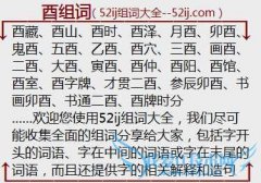 组词大全详解[酉组词]如:酉藏、酉山、酉时、酉泽、月酉、卯酉、鬼酉、五酉、乙酉、酉穴、三酉、画酉、二酉、大酉、寅酉、酉仲、酉阳、酉馆、酉室、酉字牌、才贯二酉...