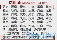 组词大全详解[岚组词]如:阴岚、浮岚、春岚、山岚、霜岚、随岚、雾岚、秋岚、岚岫、岚翠、岚瘴、岚雾、岚彩、岚气、岚峰、岚霏、岚烟、岚光、孤岚、峰岚、风岚、冻岚...