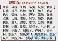 组词大全详解[腕组词]如:断腕、斗腕、护腕、皓腕、鼓腕、素腕、脱腕、腕足、铁腕、腕子、腕法、腕表、腕头、运腕、枕腕、把腕、弱腕、臂腕、扼腕、大腕、玉腕、肘腕...