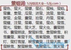 组词大全详解[萤组词]如:萤色、萤火、萤爝、萤石、萤烛、萤焰、萤囊、集萤、瓜萤、迸萤、流萤、蛰萤、聚萤、金萤、囊萤、拾萤、丹萤、萤案、萤耀、注萤、萤幕、萤鉴...