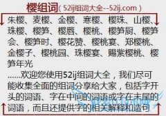 组词大全详解[樱组词]如:朱樱、麦樱、金樱、寒樱、樱珠、山樱、珠樱、樱笋、樱唇、樱桃、樱笋厨、樱笋会、樱笋时、樱花赞、樱桃宴、郑樱桃、金樱子、樱桃园、珠樱宴...