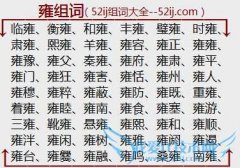 组词大全详解[雍组词]如:临雍、衡雍、和雍、丰雍、璧雍、时雍、肃雍、熙雍、羊雍、雍容、雍正、雍雍、雍豫、雍父、秦雍、雍府、雍肃、雍平、雍门、雍狂、雍害、雍恬...