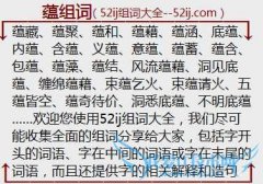 组词大全详解[蕴组词]如:蕴藏、蕴聚、蕴和、蕴藉、蕴涵、底蕴、内蕴、含蕴、义蕴、意蕴、蕴蓄、蕴含、包蕴、蕴藻、蕴结、风流蕴藉、洞见底蕴、缠绵蕴藉、束蕴乞火、...
