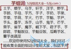 组词大全详解[芋组词]如:土芋、煨芋、乌芋、轩芋、洋芋、野芋、芋郎、芋母、芋艿、芋子、芋奶、芋渠、芋栗、芋荷、芋火、竹芋、芋魁、芋尹、芋头、番芋、冻芋、山芋...