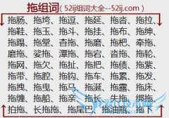 组词大全详解[拖组词]如:拖肠、拖垮、拖逗、拖延、拖沓、拖拉、拖鞋、拖玉、拖斗、拖挂、拖布、拖绅、拖蹋、拖堂、杳拖、拖磨、拖杷、牵拖、磨拖、娑拖、潭拖、拖宕...