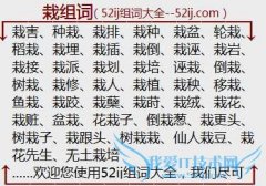 组词大全详解[栽组词]如:栽害、种栽、栽排、栽种、栽盆、轮栽、稻栽、栽埋、栽插、栽倒、栽诬、栽岩、栽接、栽派、栽划、栽培、诬栽、倒栽、树栽、栽修、栽人、栽植...