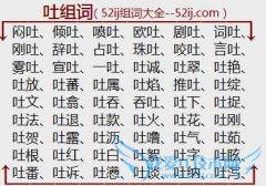 组词大全详解[吐组词]如:闷吐、倾吐、喷吐、欧吐、剧吐、词吐、刚吐、辞吐、占吐、珠吐、咬吐、言吐、雾吐、宣吐、一吐、吐诚、吐翠、吐艳、吐放、吐蕃、吐属、吐焰...
