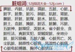 组词大全详解[脏组词]如:脾脏、内脏、抗脏、搞脏、五脏、心脏、脏字、脏象、脏污、肺脏、肮脏、肾脏、腑脏、肝脏、脏煤、脏水、脏乱、脏器、脏土、血脏、腌脏、脏话...