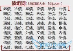 组词大全详解[债组词]如:老债、冷债、举债、京债、孽债、公债、国债、揭债、解债、画债、还债、放债、负债、遗债、顶债、躲债、笔债、逋债、逼债、诗债、睡债、讨债...