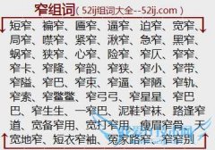 组词大全详解[窄组词]如:短窄、褊窄、匾窄、逼窄、迫窄、宽窄、局窄、噤窄、紧窄、湫窄、急窄、黑窄、蜗窄、狭窄、心窄、险窄、窄仄、窄窄、窄卡、窄隆、窄韵、窄狭...