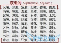 组词大全详解[液组词]如:凤液、津液、炼液、泪液、香液、霞液、消液、唾液、温液、星液、白液、鼻液、试液、渖液、矢液、石液、霜液、太液、汤液、体液、幽液、银液...