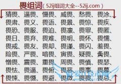 组词大全详解[畏组词]如:猜畏、逼畏、慑畏、威畏、愁畏、畏涂、畏肃、畏义、畏语、畏景、畏惊、畏疾、畏恐、畏服、畏迫、畏凛、畏罪、畏匿、畏日、畏弃、畏难、畏明...