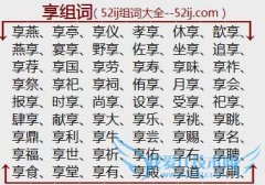 组词大全详解[享组词]如:享燕、享亭、享仪、孝享、休享、歆享、燕享、宴享、野享、佐享、坐享、追享、享荐、享国、享劳、享寿、享味、享祚、享祭、享祀、享祠、侑享...