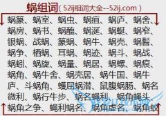 组词大全详解[蜗组词]如:蜗篆、蜗室、蜗虫、蜗疽、蜗庐、蜗舍、蜗房、蜗书、蜗醢、蜗涎、蜗蜒、蜗窄、银蜗、战蜗、篆蜗、蜗牛、蜗壳、蜗髫、蜗争、栖蜗、耳蜗、蜗迹...