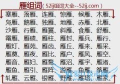 组词大全详解[雁组词]如:塞雁、落雁、连雁、惊雁、候雁、木雁、凫雁、鹅雁、独雁、地雁、赤雁、北雁、沙雁、行雁、雁翼、斜雁、食雁、舒雁、霜雁、雁碛、雁柱、雁封...