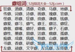 组词大全详解[癖组词]如:狂癖、酒癖、清癖、奇癖、马癖、地癖、传癖、词癖、诗癖、画癖、瑰癖、官癖、怪癖、恶癖、症癖、痰癖、谦癖、钱癖、癖爱、癖习、癖气、癖王...