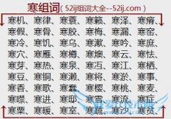 组词大全详解[寒组词]如:寒机、寒律、寒蓑、寒籁、寒泽、寒瘠、寒假、寒骨、寒胶、寒梅、寒漏、寒窑、寒冷、寒饥、寒乌、寒漱、寒吟、寒庶、寒穴、寒雁、寒樽、寒燠...